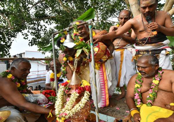 கோவை வெள்ளலூர் மகாலிங்கபுரம் ஸ்ரீ மாணிக்க விநாயகர் கோவிலில் நடந்த கும்பாபிஷேக விழாவில் கோபுர கலசத்திற்கு புனித நீர் ஊற்றிய சிவாச்சாரியார்கள்.