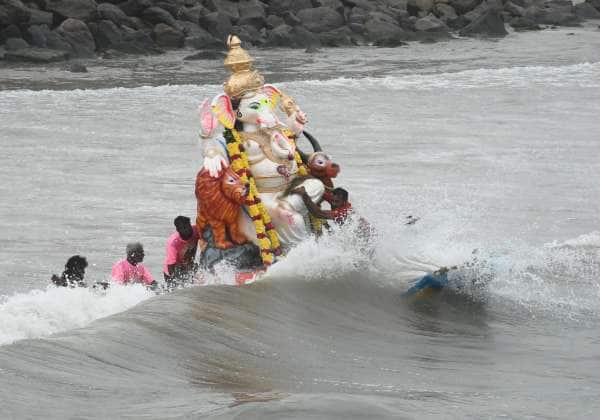 விநாயகர் சதுர்த்தி முன்னிட்டு சென்னை திருவொற்றியூர் கடற்கரையில் பைபர் படகு மூலம் விநாயகர் சிலைகள் கடலில் கரைக்கப்பட்டன.இடம்: பாப்புலர் எடை மேடை அருகே.