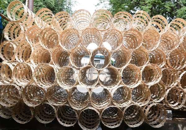 மரக்கன்றுகள் வளர்க்க பயன்படும் மூங்கில் பிரம்புகளால் ஆன தட்டிகள் விற்பனைக்காக அடுக்கி வைக்கப்பட்டுள்ளன.இடம்.உடுமலை