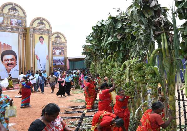 மதுரையில் நடந்த நலத்திட்ட உதவி வழங்கும் விழாவில் பங்கேற்ற பெண்கள், விழா முடிந்ததும், வாழை தோரணங்கள் உள்ள வாழைத்தார்களை எடுத்துச் சென்றனர்.