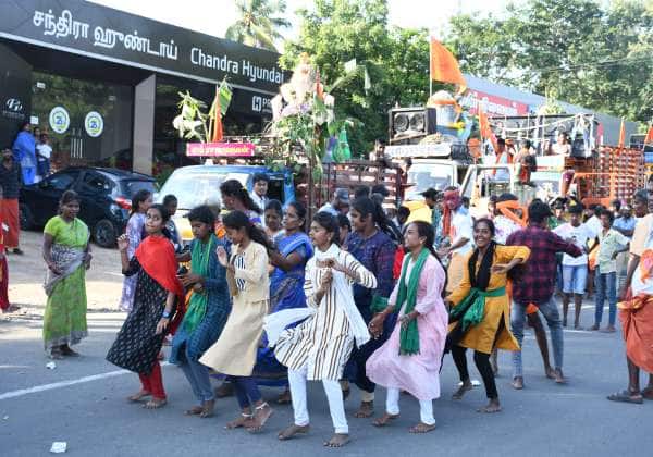 பொள்ளாச்சி அம்பராம்பாளையம் ஆற்றில் விநாயகர் சிலையை விசர்ஜனம் செய்ய கொண்டு சென்ற போது நடனமாடிய பெண்கள். இடம்: பல்லடம் ரோடு.