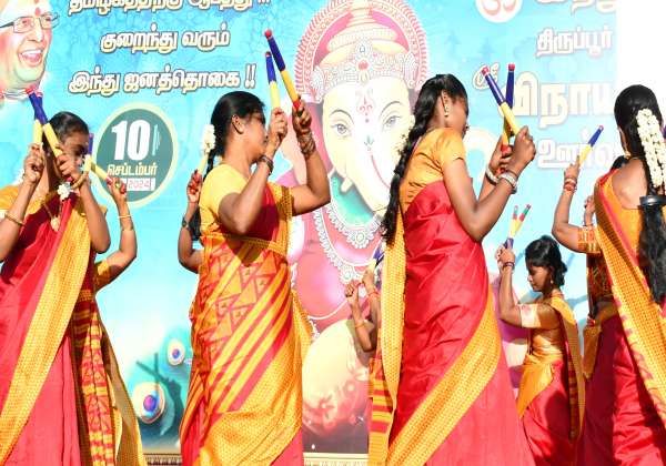 திருப்பூரில், இந்து முன்னணி சார்பில் விநாயகர் சிலை விசர்ஜன ஊர்வலம் புது பஸ் ஸ்டாண்டில் துவங்கியது. இதில் கோலாட்டம் ஆடிய பெண்கள்.