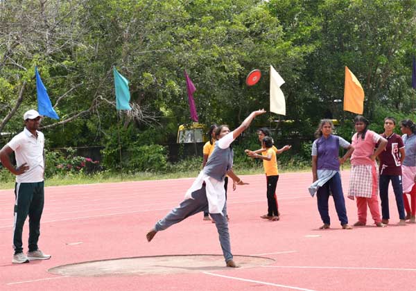 திருவண்ணாமலை மாவட்ட விளையாட்டு அரங்கில் முதல்வர் கோப்பைக்கான விளையாட்டுப் போட்டியில் நடந்த தடகளப் போட்டியில் வெற்றி இலக்கை நோக்கி வட்டு எரியும் மாணவி.