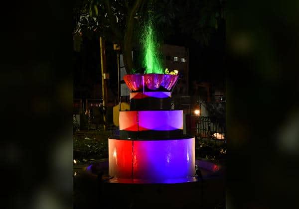 திருப்பூர், குமரன் ரோட்டில் அமைக்கப்பட்டுள்ள செயற்கை நீரூற்று மின்னொளியல் ஜொலிக்கிறது.