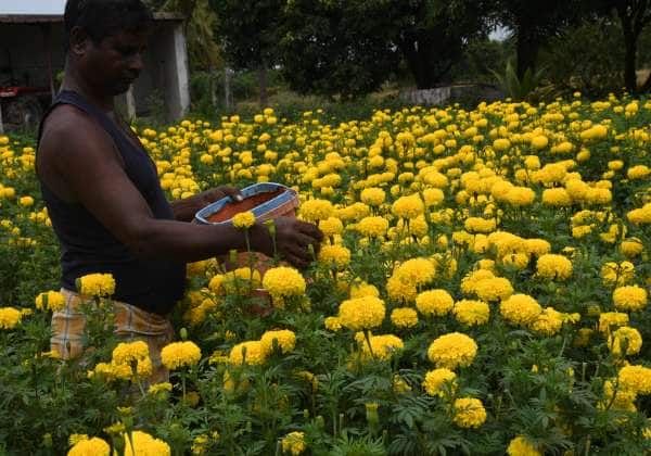 திருவள்ளூர் அருகே உள்ள கைவண்டூர் கிராமத்தில் விவசாய நிலத்தில் வளர்ந்துள்ள சாமந்தி பூக்கள்