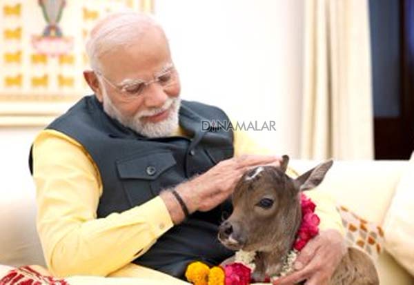 டில்லியில் உள்ள பிரதமர் வீட்டில் பசு கன்று ஒன்றை ஈன்றுள்ளது. இதனை அவர் கொஞ்சி மகிழ்ந்தார்.