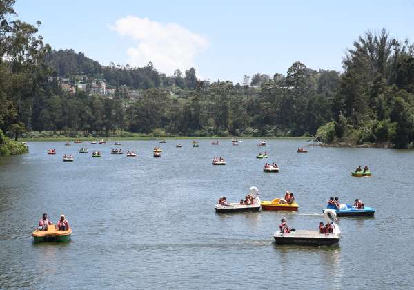 சுற்றுலா பயணிகள் படகு சவாரி சென்றனர். இடம்: ஊட்டி படகு இல்லம்.