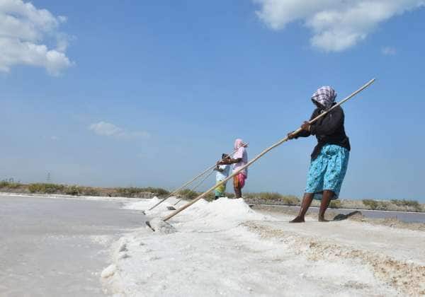தூத்துக்குடி உப்பளத்தில் வெயிலையும் பொருட்படுத்தாமல் உப்பு எடுக்கும் பணியில் ஈடுபட்டுள்ள பெண்கள்.