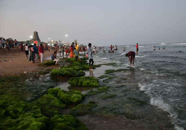 திருச்செந்தூர் கடற்கரையில் வழக்கத்திற்கு மாறாக கடல் உள்வாங்கி காணப்பட்டதால் வெளியில் தெரிந்த பாறைகள்.