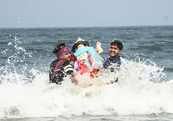 விஸ்வகர்மா தினத்தை முன்னிட்டு தொழில்செய்யும்இடத்தில்வைத்து வழிபட்ட விஸ்வகர்மா சிலைகள் நேற்று சென்னை காசிமேடு கடற்கரையில் கரைத்தனர்.