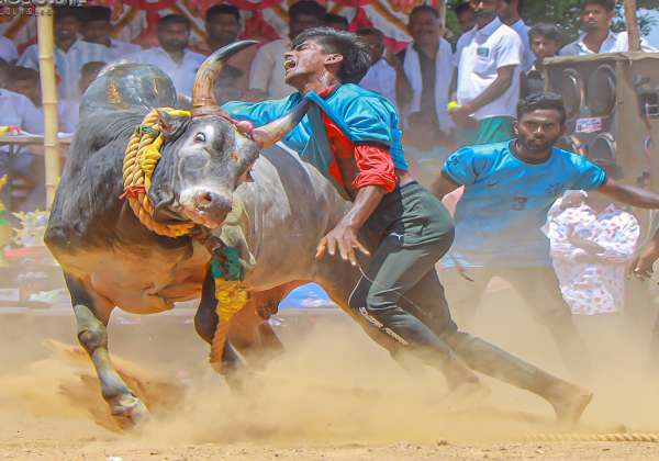 காளையார் கோவில் அருகே கெளரிப்பட்டி சந்தனகருப்பர் கோயில் முளைப்பாரி திருவிழாவை முன்னிட்டு நடந்த வடமாடு மஞ்சுவிரட்டில் சீறிப்பாயும் காளை.