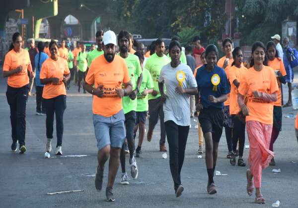 இளம் வயது மாரடைப்பு பாதிப்புகள் குறித்த விழிப்புணர்வு பல்ஸ் ஹாட்டத்தான் , நிகழ்ச்சியில் பங்கேற்ற வீரர்கள் மற்றும் வீராங்கனைகள். இடம்:கோவை, காந்திபுரம்.