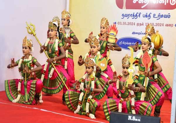 நவராத்திரியை முன்னிட்டு சென்னை வடபழநி ஆண்டவர் கோவிலில் வைக்கப்பட்டுள்ள சக்தி கொலுவின் இரண்டாம் நாளில் நடந்த கலை நிகழ்ச்சி