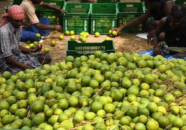 சென்னை கோயம்பேடு மார்கெட்டிற்கு விற்பனைக்கு வந்துள்ள சாத்துக்குடி பழங்களை தரம் பிரிக்கும் பணிகளில் ஈடுபட்டுள்ள தொழிலாளர்கள்.