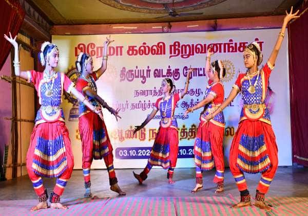 நவராத்திரி விழாவை முன்னிட்டு திருப்பூர், ஸ்ரீவிஸ்வேஸ்வரர் கோவிலில் பிரேமா கல்வி நிறுவனம் மற்றும் வடக்கு ரோட்டரி இணைந்து நடந்த கலைநிகழ்ச்சியில் பங்கேற்ற கே.ஜி.எஸ்., மெட்ரிக் பள்ளி மாணவிகள்.