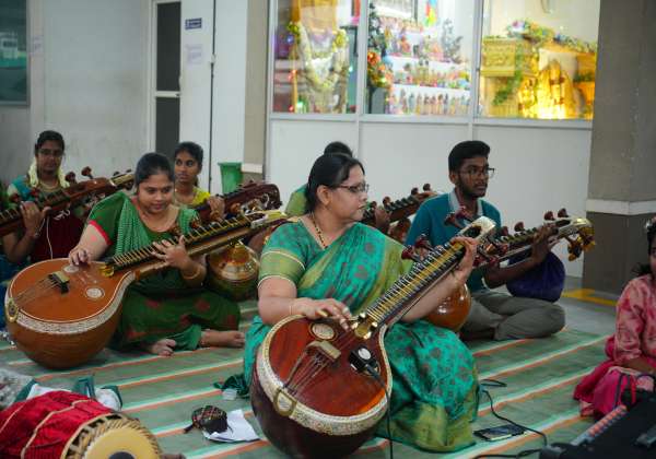 சிறுவாணி மெயின் ரோடு தெலுங்குபாளையத்தில் உள்ள ஸ்ரீதர்ஷா அறிவா அப்பார்ட்மெண்டில் நவராத்திரி குழுவில் வீணை வாசித்து கொண்டாடினர்