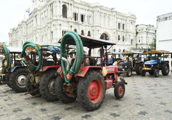 பருவமழையை எதிர்கொள்ள சென்னை ரிப்பன் மாளிகை வளாகத்தில் டிராக்டர் வண்டியுடன் தயார் நிலையில் உள்ள மோட்டார் பம்புகள்.