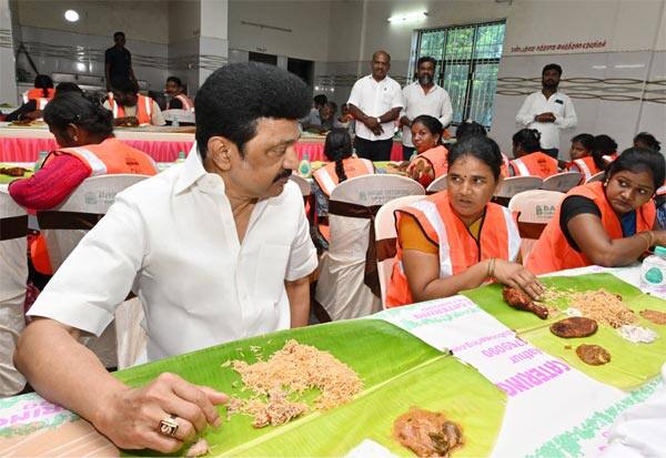 கொளத்தூர், ஜம்புலிங்கம் பிரதான சாலையில் உள்ள காமராஜர் சத்திரத்தில் 600 தூய்மைப் பணியாளர்களுக்கு பிரியாணியுடன் கூடிய மதிய உணவினை முதல்வர் ஸ்டாலின் பரிமாறி, அவர்களுடன் உணவருந்தினார்.