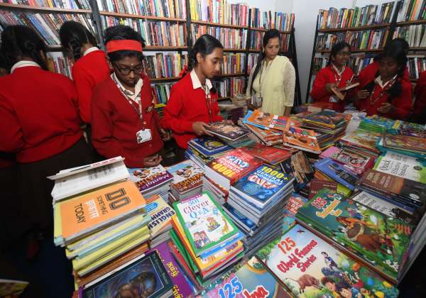 ஊட்டி பழங்குடியினர் பண்பாட்டு மையத்தில், நடைபெற்று வரும் புத்தக கண்காட்சியை காண வந்த அரசு பள்ளி மாணவிகள்.