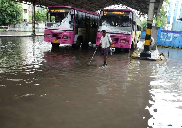 சென்னை மந்தைவெளி பேருந்து நிலையத்தில் தேங்கிய மழை நீரால் பஸ் பயணிகள் அவதி.