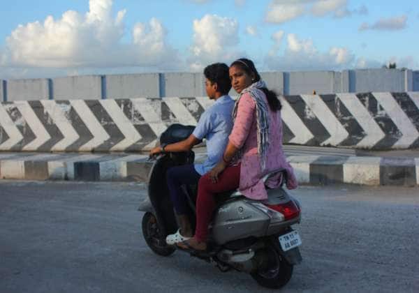 பள்ளி சீருடையில் பெற்றோரை வைத்து இரு சக்கர வாகனத்தை ஓட்டி செல்லும் மாணவர்.இடம்- தாம்பரம்