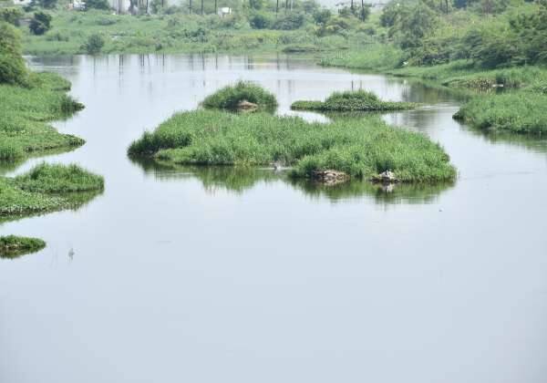 தீவு போல் காட்சியளிக்கும் நொய்யல் ஆறு. இடம்: திருப்பூர், காசிபாளையம்.