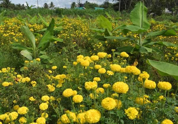 தேனி மாவட்டம் கோட்டூரில் வாழையில் ஊடு பயிராக செண்டு பூ சாகுபடி செய்துள்ளனர்.