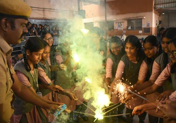 தீபாவளி பண்டிகையை முன்னிட்டு கோவை ஒப்பணக்கார வீதி மாநகராட்சி பெண்கள் மேல்நிலைப்பள்ளியில் தீயணைப்பு துறை அலுவலர், பாதுகாப்பாக பட்டாசு வெடிப்பது எப்படி என்று செயல்முறை விளக்கம் அளித்தார்.