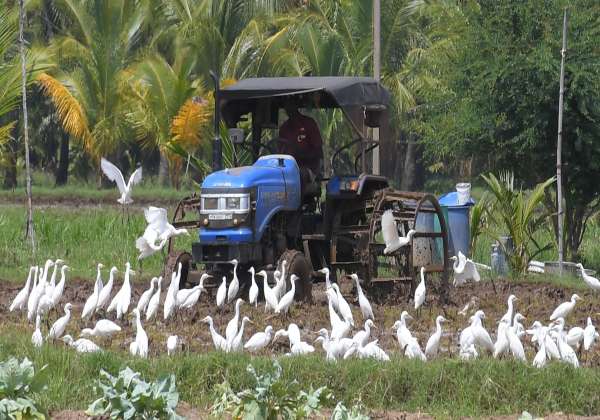 தேனி அருகே அம்மச்சியாபுரத்தில் டிராக்டர் மூலம் உழவு பணி நடந்தது. அப்போது, இரை தேடி காத்திருந்த பறவைகள்.