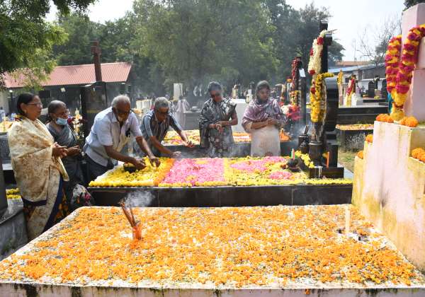 கல்லறை தினத்தை முன்னிட்டு மறைந்த முன்னோர் கல்லறையில் அஞ்சலி செலுத்திய கிறிஸ்தவர்கள். இடம் : கோவை சுங்கம் ஆர்.சி., கல்லறை தோட்டம்.