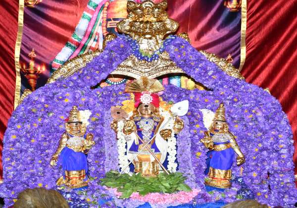 திருப்பூர், விஸ்வேஸ்வரர் கோவிலில் கந்த சஷ்டி கவசம் விழாவை முன்னிட்டு ஊதா நிறப் பூக்கள் அலங்காரத்தில் அருள்பாலித்த முருகன்.