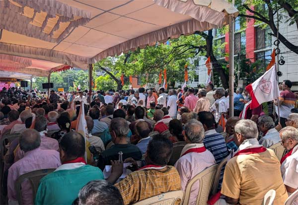 சென்னை, எழும்பூர் ராஜரத்தினம் மைதானத்தில் பிராமணர்களின் பாதுகாப்பை உறுதி செய்ய வலியுறுத்தி அர்ஜூன் சம்பத் தலைமையில் இந்து மக்கள் கட்சி சார்பில் ஆர்ப்பாட்டம் நடைபெற்றது. இதில் பங்கேற்ற கூட்டத்தின் ஒரு பகுதியினர்.