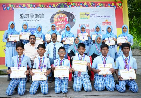தினமலர் மாணவர் பதிப்பான பட்டம் இதழ் சென்னை இன்ஸ்டியூட் ஆப் டெக்னாலஜி எஸ் எஸ் வி எம் கல்விக்குழுமம் ஆகியன இணைந்து வழங்கும் பதில் சொல் பரிசை வெல் வினாடி வினா நிகழ்ச்சி கோவை கரும்புக்கடை ஜீவன் பள்ளியில் நேற்று நடந்தது இதில் பரிசு பெற்ற மாணவ மாணவிகளுடன் இடமிருந்து வலம் நிர்வாக அலுவலர் முகமத் ரியாஜிதின், முதல்வர் சிவக்குமார், மற்றும் ஒருங்கிணைப்பாளர்கள் அஸ்மா பிர்தெளஸ் , ஷம்மா பானு .