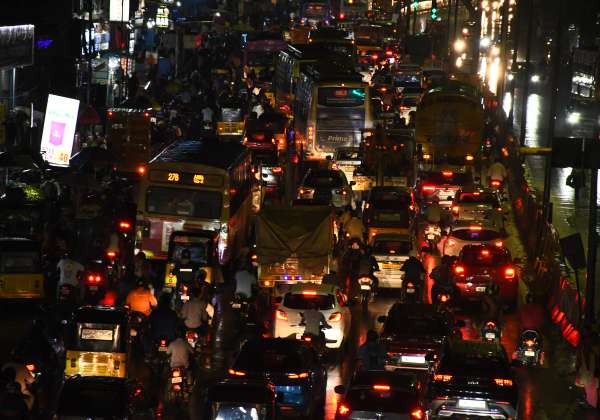 சென்னையில் பெய்த மழையில் ஊர்ந்து சென்ற வாகனங்களால் பூந்தமல்லி நெடுஞ்சாலையில் போக்குவரத்து நேற்று (அக்-6) நெரிசலில் சிக்கி தவித்த வாகனங்கள் , இடம். அமைந்தகரை.