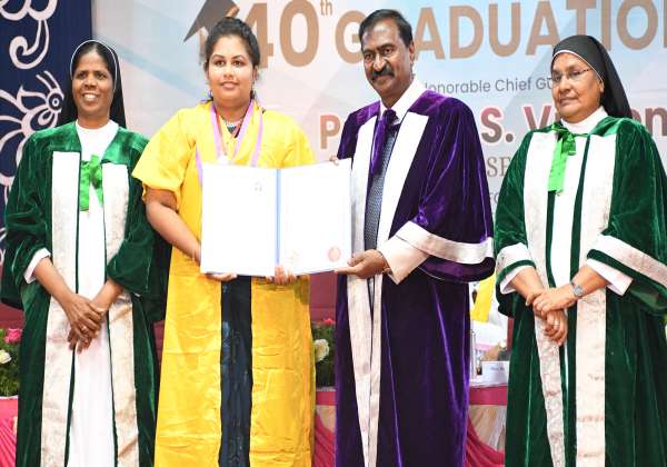 கோவை ரேஸ்கோர்ஸ் நிர்மலா மகளிர் கல்லூரியில் நடைபெற்ற 40 வது பட்டமளிப்பு விழா நிகழ்ச்சியில் தமிழ்நாடு மாநில அறிவியல் மற்றும் தொழில்நுட்ப கவுன்சில் உறுப்பின செயலர் வின்சென்ட் மாணவிகளுக்கு பட்டங்களை வழங்கினார் அருகில் (இடமிருந்து) கல்லூரி முதல்வர் மேரி பபியோலா, செயலர் குழந்தை தெரஸ்.