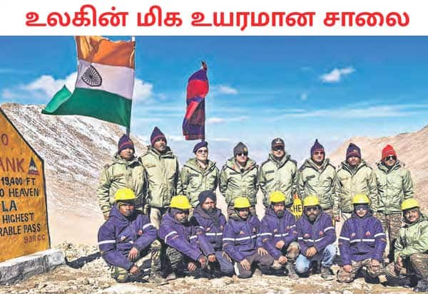 பி.ஆர்.ஓ., எனப்படும் எல்லை சாலை அமைப்பு சார்பில், லடாக்கின் மிக் லா பாஸ் பகுதியில் கடல் மட்டத்தில் இருந்து 19,400 அடி உயரத்தில் அமைக்கப்பட்டுள்ள, உலகின் உயரமான சாலையில், கட்டுமான பணியாளர்கள் புகைப்படம் எடுத்துக் கொண்டனர்.