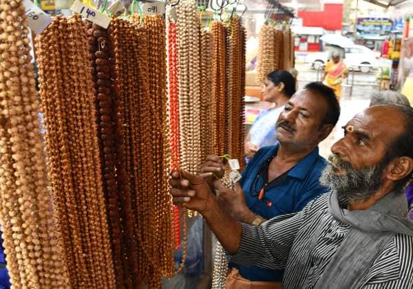 கார்த்திகை துவங்குவதையொட்டி சபரிமலை செல்வதற்காக மாலை அணிய பூஜை பொருட்கள் மற்றும் மாலை வாங்கும் பக்தர்கள் . இடம்: கோவை சித்தாபுதூர் ஐயப்பன் கோவில் அருகே.