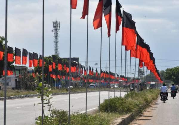 தூத்துக்குடி மாவட்டத்தில் பல்வேறு நிகழ்ச்சிகளில் கலந்துகொண்ட துணை முதல்வர் உதயநிதியை வரவேற்க பைபாஸ் சாலையில் ஆபத்தான முறையில் வைக்கப்பட்டுள்ள தி.மு.க., கொடி கம்பங்கள்.