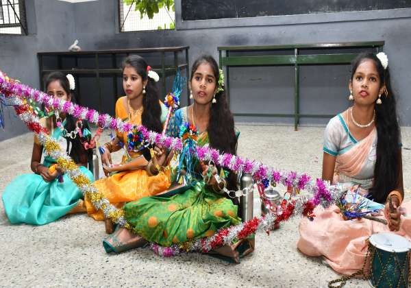 திருப்பூர், ஜெய்வாபாய் பெண்கள் பள்ளியில் நடந்த மாவட்ட அளவிலான கலைத்திருவிழாவில் வில்லுப்பாட்டு பாடிய மாணவியர் .