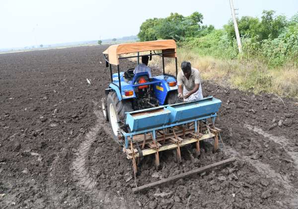 சமீபத்தில் பெய்த மழைக்கு விளை நிலத்தில் டிராக்டர் மூலம் பனிக்கடலை விதைக்கும் விவசாயி.இடம்.உடுமலை கணபதிபாளையம்.