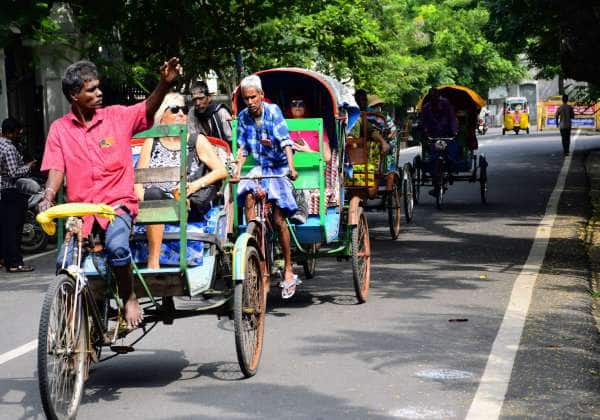 புதுச்சேரிக்கு வருகை தரும் வெளிநாட்டு சுற்றுலா பயணிகள் சொகுசு கார்களை விரும்பாமல் எளிமையாக ரிக்ஷா வண்டியின் சுற்றி பார்த்து வருகின்றனர்.