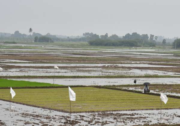 திருநெல்வேலி மாவட்டம் பாலாமடை பகுதியில் வயலில் பயிரிடப்பட்டுள்ள நெற் பயிர்களை பறவைகளிடமிருந்து பாதுகாக்க குடையுடன் வயலில் அமர்ந்துள்ள விவசாயி.