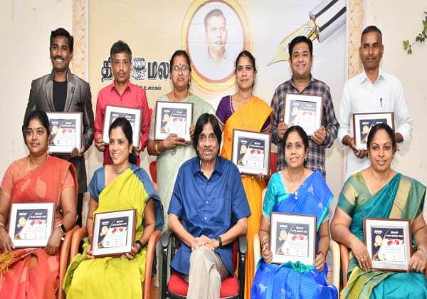 தினமலர் நாளிதழ் லட்சிய ஆசிரியர் விருது வழங்கும் விழா கோவை சுந்தராபுரத்திலுள்ள தினமலர் அலுவலக வளாகத்தில் நடந்தது. இதில் விருது பெற்ற ஆசிரியர்களுடன் அண்ணாபல்கலை முன்னாள் துணைவேந்தர் பாலகுருசாமி.