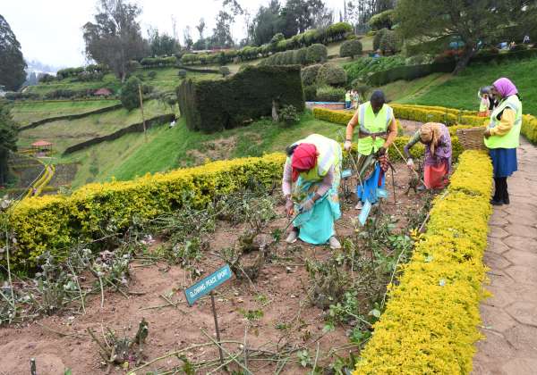 ஊட்டி ரோஜா பூங்காவில், கோடை சீசனுக்காக ரோஜா செடிகள் புருனிங் பணிகள் நடந்து வருகிறது.
