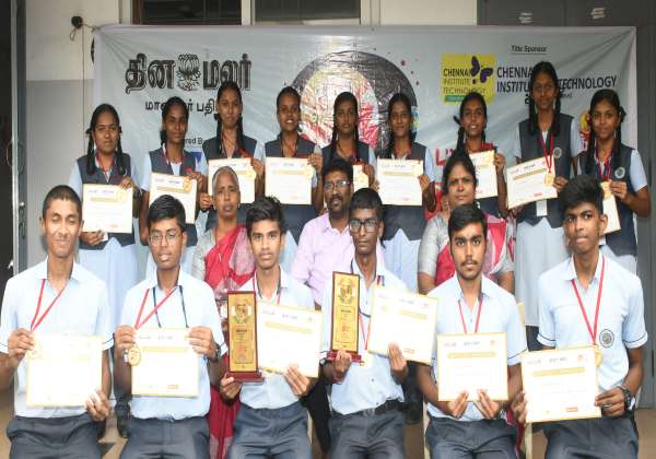 தினமலர் நாளிதழ் மாணவர் பதிப்பான பட்டம் மற்றும் சென்னை இன்ஸ்டிடியூட் ஆப் டெக்னாலஜி, எஸ்.எஸ்.வி.எம்., கல்வி குழுமம், இணைந்து வழங்கும் பதில் சொல் ; பரிசை வெல் வினாடி - வினா நிகழ்ச்சி, திருப்பூர் பி. என். ரோடு, ஸ்ரீ சாய் மெட்ரிக் பள்ளியில் நடந்தது. வெற்றி பெற்ற மாணவர்களுடன் இடமிருந்து பட்டம் ஒருங்கிணைப்பாளர் மகேஸ்வரி, முதல்வர் சுரேஷ்குமார், துணை முதல்வர் காஞ்சனா.