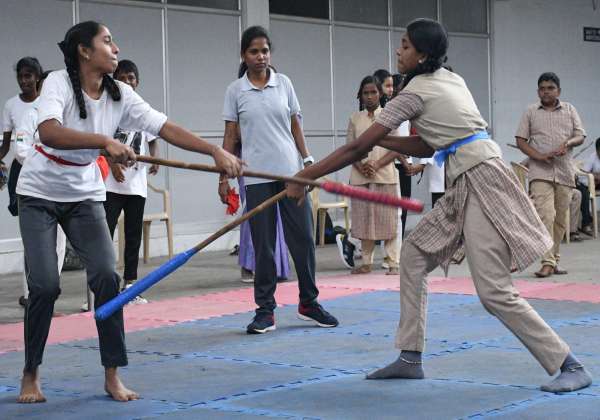 கோவை சரவணம்பட்டி குமரகுரு கல்லூரி உள்விளையாட்டு அரங்கில் நடைபெற்ற மாநகராட்சி பள்ளி மாணவர்களுக்கான சிலம்பம் போட்டியில் தன் திறமையை வெளிப்படுத்திய வீராங்கனைகள்.