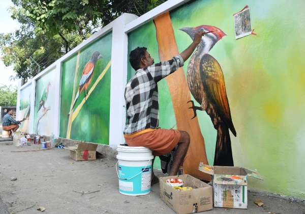கோவை வனக் கல்லூரி வளாக சுற்றுச்சுவரில், இயற்கை சார்ந்த ஓவியங்கள் வரையப்பட்டு வருகின்றன.