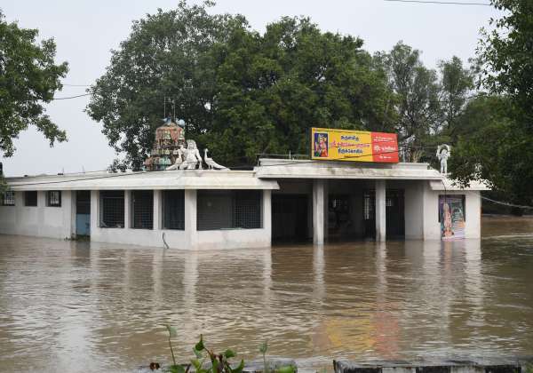 விழுப்புரம் முத்தம்பாளையம் முருகர் கோவில் மழை நீரில் பாதியளவு மூழ்கியது.