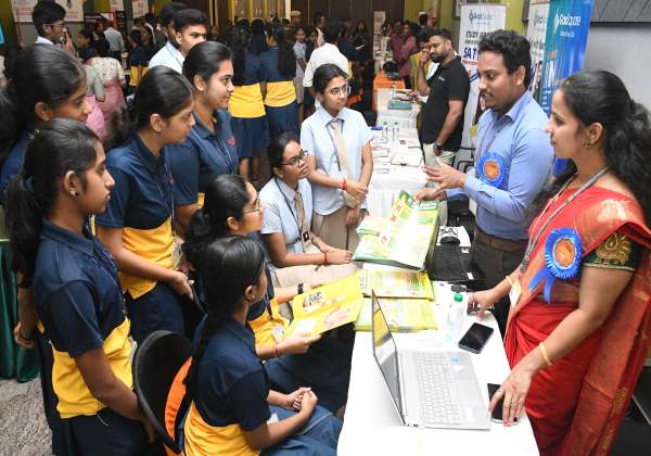 கோவை பீளமேடு நேஷனல் மாடல் பள்ளி அரங்கில் நடைபெற்ற கரியர் பாத் நிகழ்ச்சியை இடம்பெற்றுள்ள அரங்கை பார்வையிட்ட பள்ளி மாணவிகள்.