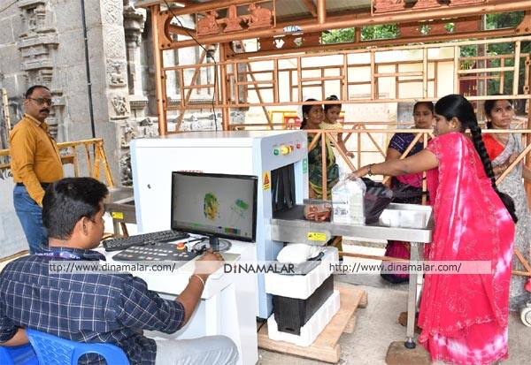 திருவண்ணாமலை அருணாசலேஸ்வரர் கோவில் கார்த்திகை தீபத்திருவிழாவை முன்னிட்டு, அம்மன் கோபுரத்தின் நுழைவுவாயிலில், பக்தர்கள் கொண்டு வரும் பை உள்ளிட்ட பொருட்களை போலீசார் கம்ப்யூட்டர் ஸ்கேனிங் மூலம் தீவிர பரிசோதனைக்குப் பிறகு அனுமதித்தனர்.